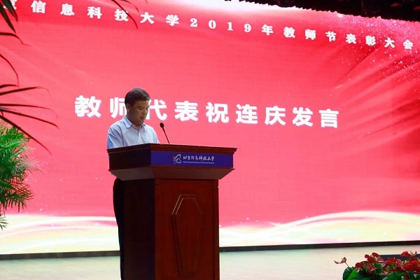 祝连庆教授作为教师代表上台发言。他表示,近年来在学校党委的坚强领导下,“五个环境建设”持续落地,学校各方面发展建设取得实效让广大教职工看到了学校发展的希望。他号召广大教师要始终保持一份不断奋进的事业心,始终保持一股锐意进取的干劲,始终保持一种勤奋敬业的热情,做一名让学生一生中幸运遇到的好老师。