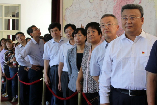参观学习革命旧址后,循着总书记的足迹,参观人员来到香山脚下的香山革命纪念馆,参观《为新中国奠基——中共中央在香山》主题展览。不忘来时路,方能得始终。在展馆入口毛泽东同志的塑像下,全体参观人员面向党旗,高举右拳,在校党委书记王传亮同志的带领下重温入党誓词,字字铿锵,声声回响,回顾作为一名共产党人的初心,再次许下共产党员的庄严承诺,彰显了全体党员领导干部坚定的政治信念。展览由“进京‘赶考’”、“进驻香山”、“继续指挥解放全中国”、“新中国筹建”、“不忘初心、牢记使命、永远奋斗”五个部分组成,将中共中央在香山期间领导全国各族人民,完成民族独立和人民解放的历史使命、开启中国历史发展新纪元的光辉历程生动呈现。党员干部们仔细聆听,驻足参观,细细品读,回望那段不朽的革命岁月,感触深刻,震撼良久。