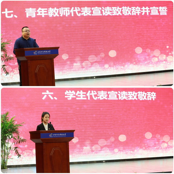 杏坛薪火传承不息,师德教风润物无声。自动化学院范军芳老师代表青年教师发言。他回忆了自己走上教师岗位以来,一位位前辈教师的言传身教,使他实现从“学者”到“师者”的转变。他感慨道,前辈们传递的不仅仅是日积月累的经验方法,也是兢兢业业,诲人不倦的师德师风。在范军芳的带领下,参加仪式的一百余位新入职教职工庄严宣誓。师恩浓浓,师恩难忘,学生代表宣读致敬词,表达对老师们辛勤育人的感激之情。