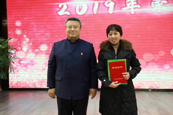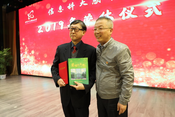 王传亮、王永生为2019年光荣退休教职工逐一颁发由校工会精心制作的《荣休证书》《荣休纪念册》。