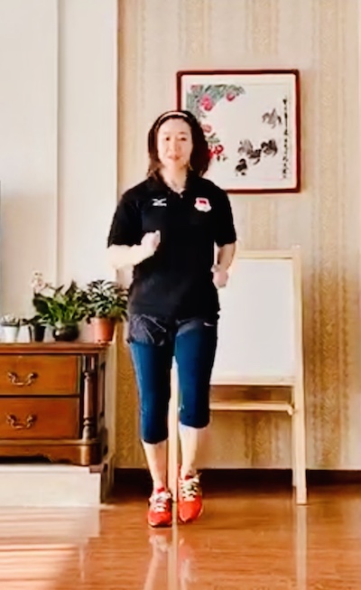 原地进行高抬腿,左手拍左膝盖,右手拍右膝盖,频率根据自己身体情况而定,做两组,每组进行10~20秒,组间10秒。