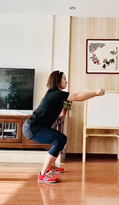 双手伸直向前分开与肩同宽,指尖向前掌心向下,屈髋屈膝下蹲至膝关节成90度,注意重心放在两腿之间,膝关节不能超过脚尖,腰背部略向前倾,进行10-15次。