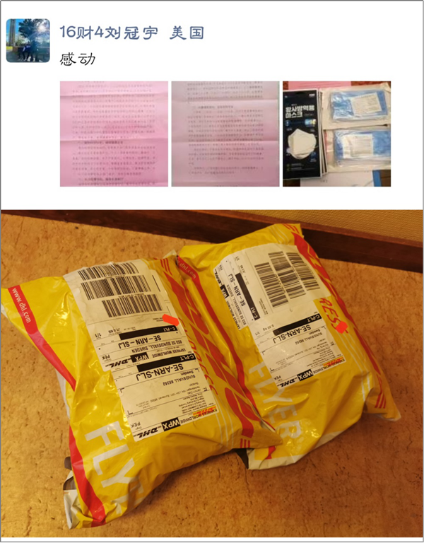 身在境外的同学们对于学校的关怀非常感动,纷纷发来信息,感谢学校不远万里寄来的“暖心礼物”。信管学院周涵同学在收到学校邮寄的防疫物资后,动情的说到:“最近国外疫情肆虐,网络上针对留学生的留言铺天盖地,这一切让周围的环境变得十分压抑。突然收到学校跨洋过海邮寄过来的防疫包裹,心中非常的温暖,虽然远在他乡,但祖国和学校从来没有忘记过我们,被牵挂着的感觉真好,真的非常感谢学校和各位领导老师的关心,我们一定会好好的,不辜负国家和学校对我们的期望。