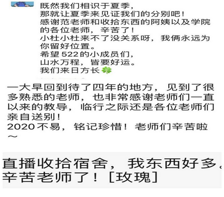 在毕业“寄“工作中,每一位老师都全身心投入。学生们看着爬高下低、汗流浃背的老师亲手为自己打包行李,不禁深受感动,纷纷留言表达感谢,在朋友圈晒图,为这个特殊毕业季增添了浓墨重彩的一笔。