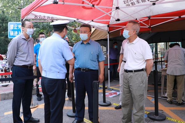 王传亮、王永生首先来到校门口,了解开学后师生进出校园管控措施,检查体温检测等各项防疫设备,并与海淀区高校交通安全联席会办公室、北京市公安局高校文保支队以及属地派出所的相关同志,就开学期间老生返校、新生报到的相关保障工作进行了详细沟通。