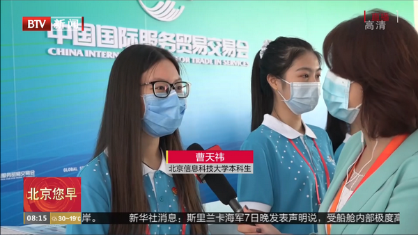 早上8点10分,北京电视台新闻频道在《北京您早》栏目直播中对三名服贸会志愿者代表进行了采访。三名志愿者同学分别负责路线引导、体温测量和科技抗疫案例展示区的展览讲解,其中负责科技抗疫案例展示区展览讲解的这位志愿者正是来自我校经管学院市场营销1901班的曹天祎同学。