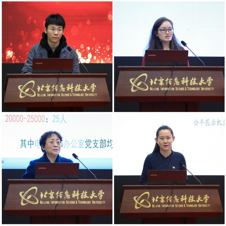 教育部“共抗疫情、爱国力行”活动获奖者徐云岫、北京高校“双百行动”计划优秀团队代表田丽娜、“学习强国”先进单位代表曹晋红、学校新闻宣传先进个人代表马川茼等四位获奖代表作交流发言。