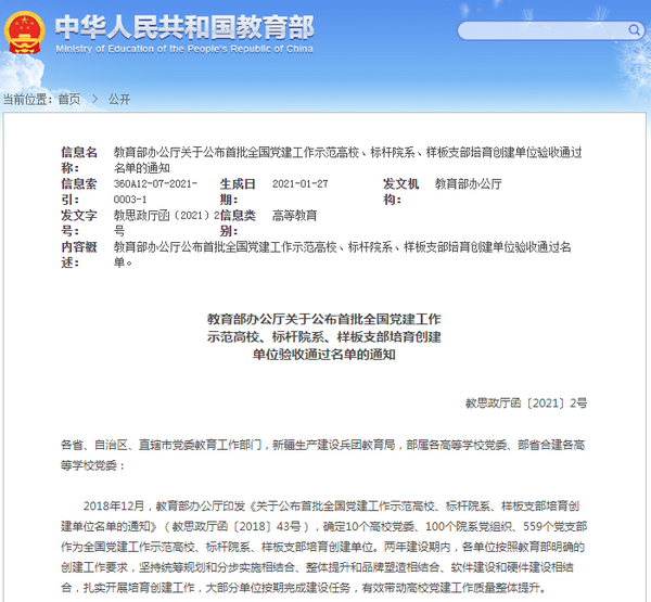 据悉,2018年12月,教育部共确定10个高校党委、100个院系党组织、559个党支部作为全国党建工作示范高校、标杆院系、样板支部培育创建单位。2020年10月以来,经创建单位对标自查总结、上级党组织满意度测评、属地党委教育工作部门把关复核、教育部思想政治工作司审查、教育部网站等公示,最终认定10个高校党委、98个院系党组织、551个党支部通过验收。(供稿:党委组织部 编辑:田驰正 审核:王学文)