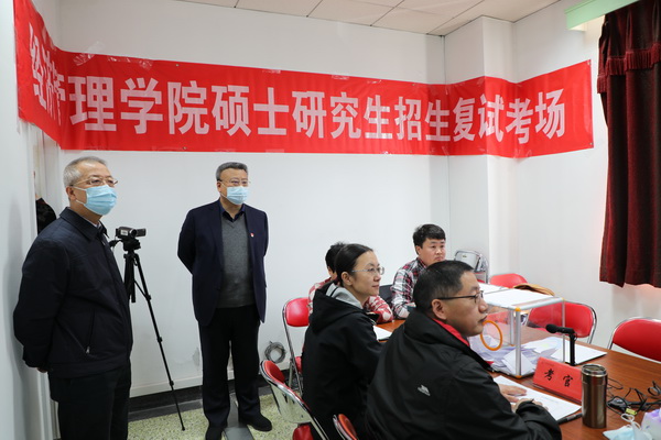 王传亮、王永生首先来到经管学院2021年研究生网络远程复试现场,详细了解网络远程复试流程和规范要求,并现场旁听了复试。
