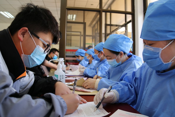 疫苗接种现场分为场外测温区、信息核查登记区、接种区、留观区和异常反应处置区。参与接种的师生,在工作人员、志愿者的引导下,依序领取并填写知情同意书、录入身份证信息、进行疫苗接种。