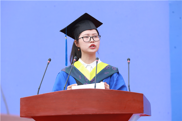 机电学院陈晓薇作为研究生毕业生代表发言,她结合自己的科研和社会实践经历,感谢母校、师长一路以来的支持,分享了自己对学习科研生活的思考和感悟,祝愿母校发展越来越好。