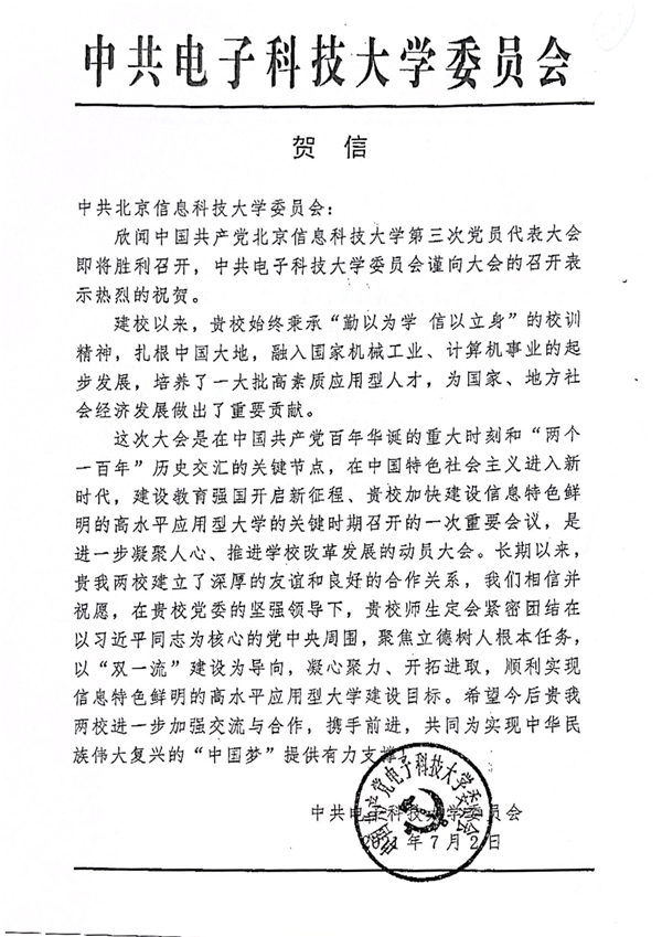 7月6日至8日,我校第三次党代会胜利召开。党代会召开前夕,学校收到北京大学、清华大学、湖南大学、电子科技大学、西安电子科技大学、北京工业大学等82所兄弟院校,中共海淀区委、中共昌平区委等党政机关发来的贺信贺电,祝贺学校第三次党代会胜利召开,预祝大会取得圆满成功!