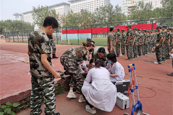 连日来,同学们认真顽强训练,医护人员全力以赴落实保障。为保证三校区军训需要,校医院全部34名医生、护士均参与军训保障。各校区每天白天4人值守、夜间2人值守。一组医护人员往往需要24小时连班。为合理调配人员,副院长刘峰、院长助理张丽被派驻清河校区,加强清河保障力量。进入伏天,晴天高温炎热,同学们晒伤、紫外线过敏多起来,晕倒、中暑等紧急情况频出,仅7月15日白天,三校区医务人员现场出诊就达10余次。天气炎热,情况紧急,又要携带急救设备,还要现场紧急救治,一趟出诊下来医生们也跟同学们一样,浑身汗水湿透。为保证能够最快速度出诊,医护人员每人兜里装着急救药品,急救设备就放在手边最明显位置,随时备战。军训以来,虽然暴晒天气不多,但空气湿度大、高温闷热,暑湿排不出,许多同学又出现中暑症状,还有许多同学训练后喝冷饮解暑导致肠胃问题。为及时有效帮助同学解决这些问题,医护人员提前准备好温度合适的开水,有时候要亲自喂学生服药,给同学们准备补液盐,以防同学们脱水,并认真做好饮食、休息等健康宣教。军训保障,看似简单,其实责任重大。清河校区一位同学心脏做过手术,但他为能参加军训没有报备,自行服药坚持。训练中出现呼吸困难,校医院清河校区张丽等医护人员全力紧急救治,及时安排其转诊,并为其申请免训。因为参训人员很多,各种状况也多,有时候晚上到夜里12点还有学生来诊。据不完全统计,仅军训前一周,校医院就接诊1300余人次。