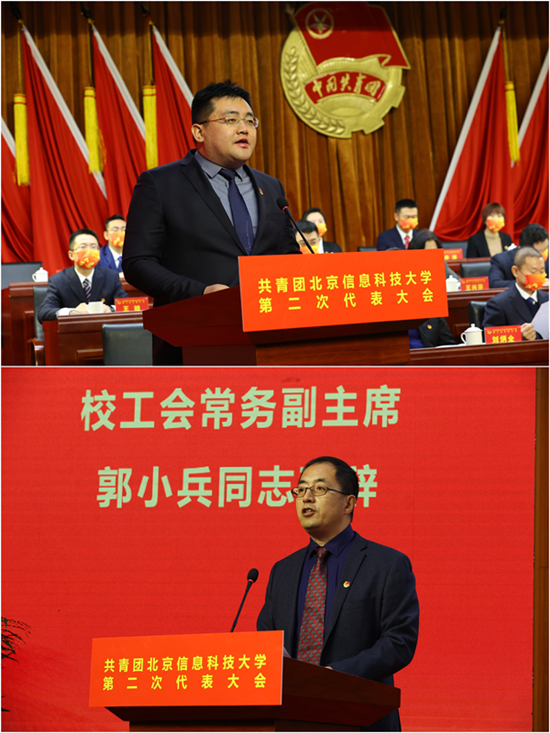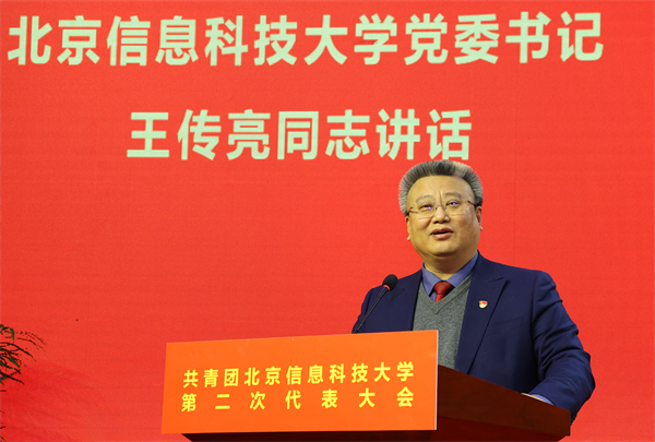 王传亮代表学校党委对大会的召开表示祝贺。他在讲话中指出,第一届团代会召开以来,北京信息科技大学共青团组织不忘初心,牢记使命,锐意改革,是学校党委的得力政治助手,是全校团员青年的可靠组织支柱,是学校与青年学生联系沟通的牢固桥梁纽带。王传亮指出,当前,我国正处于“两个一百年”奋斗目标的交汇点和学校“十四五”起步发展的新起点上,共青团要认识到当前学校工作面临的时代挑战和需要承担的时代使命,团结带领全校团员青年在实现中华民族伟大复兴中国梦的进程中不断开拓创新、奋发有为。王传亮对全校各级团组织、全体团干部和广大团员青年提出三点希望:各级团组织要坚持以政治建设为统领、聚焦主责主业;全体团干部要提高政治站位、坚守初心使命;广大团员青年要坚定理想信念、勇担青春使命。他强调,全体团干部要将个人的成长和党的事业、和学校的发展结合在一起,不弃微末、不舍寸功,一步一个脚印地成长为党的事业发展的中流砥柱。他希望各位代表要把握好学校事业发展的大局,以饱满的政治热情和严肃负责的态度,认真履行职责,积极主动地参与到学校治理体系中来。他勉励广大团员青年要以此次团代会为新的起点,与祖国共奋进,与时代同步伐,与学校齐发展,为把我校建设成为信息特色鲜明的高水平大学而努力奋斗!