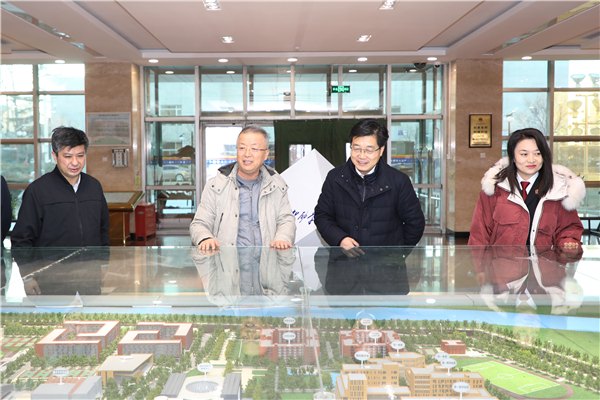 王永生在图书馆一层大厅新校区沙盘前,向杜长辉介绍了我校新校区建设与搬迁情况。