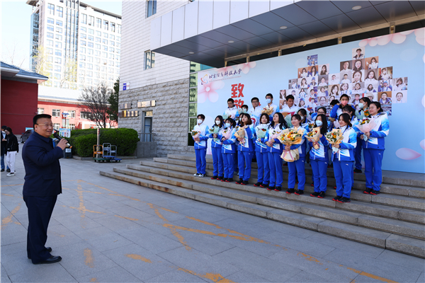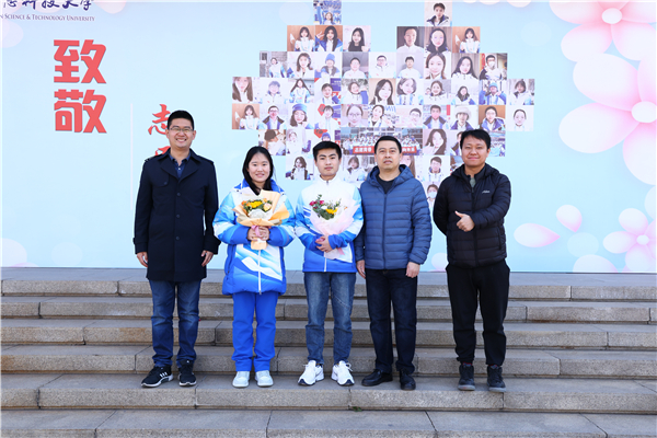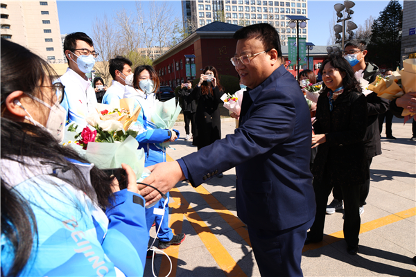 王传亮向志愿者们送上鲜花,欢迎他们平安返回学校。