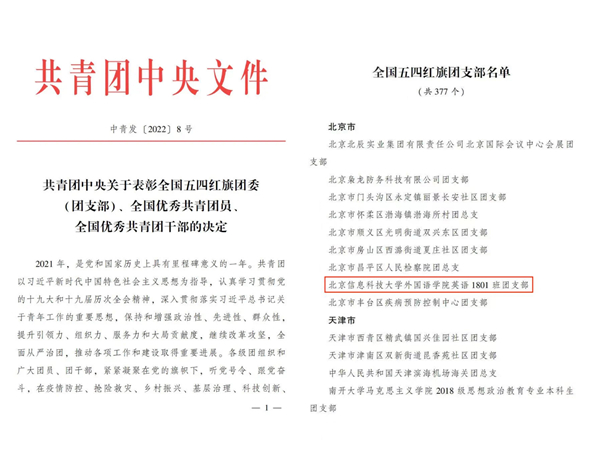 日前,共青团中央发布《关于表彰全国五四红旗团委(团支部)、全国优秀共青团员、全国优秀共青团干部的决定》,北京信息科技大学外国语学院英语1801团支部被授予“全国五四红旗团支部”称号,这也是北京市唯一获此荣誉的高校团支部。