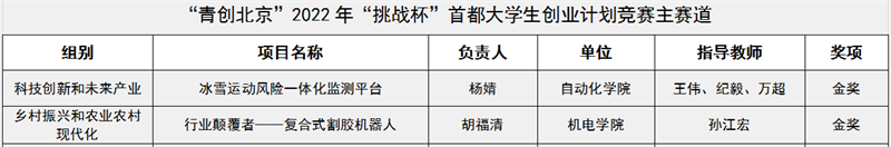 “挑战杯”首都大学生创业计划竞赛为首都高校规模最大的创业计划竞赛,是首都高校培养大学生自主创新能力和展示高等教育发展水平的重要平台。经各相关单位动员选拔,我校共有15件作品入围主赛道,揽获2项金奖、2项银奖、8项铜奖;27件作品入围专项赛道,揽获3项银奖、13项铜奖。