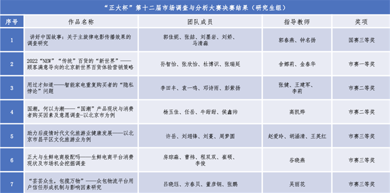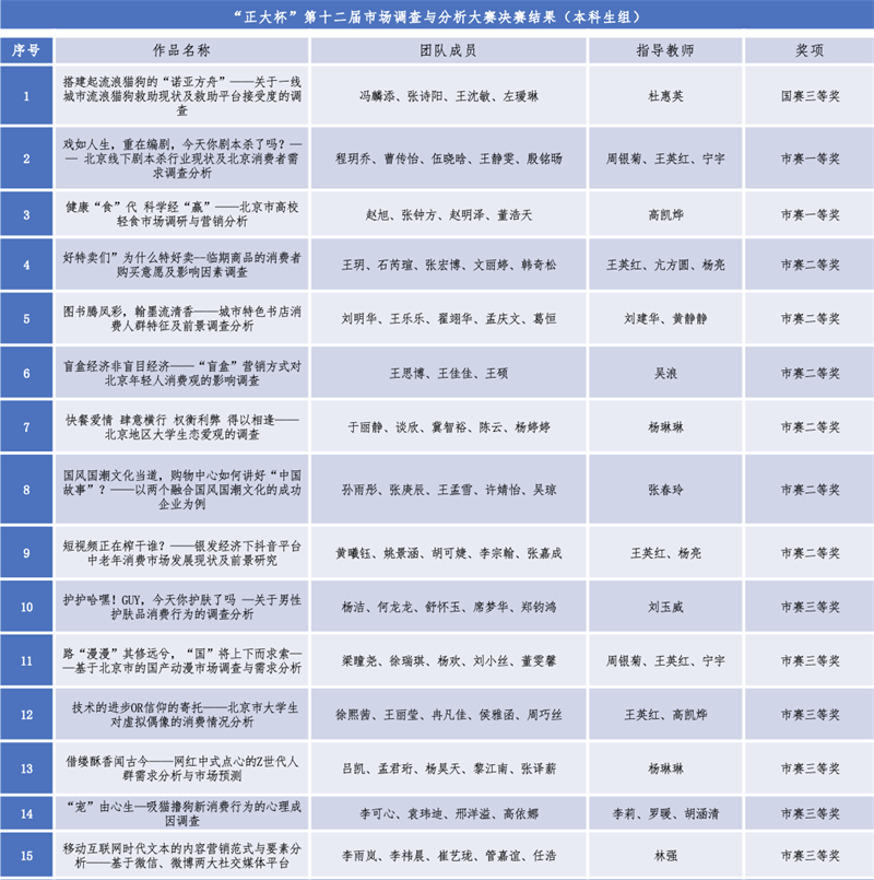 近日,“正大杯”第十二届全国大学生市场调查与分析大赛总决赛落下帷幕。我校取得了国赛三等奖2项,北京市赛一等奖3项,二等奖8项,三等奖9项的优异成绩。我校本科生组首次获得国家级奖项。