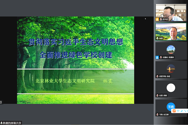 6月10日上午,学校邀请北京林业大学生态文明研究院院长、生态文明建设与管理交叉学科博士生导师林震教授作客“勤信文化大讲堂”,以线上形式作题为“贯彻落实习近平生态文明思想 全面推进绿色学校创建”的专题讲座。本期讲座旨在助力全校师生深入学习贯彻习近平生态文明思想,厚植生态环保理念,指导推进我校绿色学校创建工作。校院两级理论中心组成员、相关师生代表聆听了讲座。讲座由校党委常委、副校长叶向忠主持。