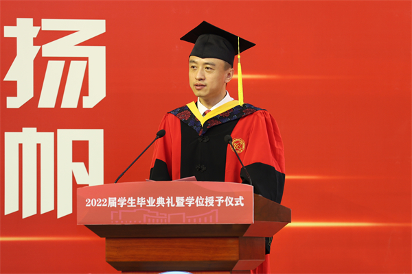 校党委副书记、校长王永生以《涵养家国情怀 坚守道义良知 强化学识根基》为题,作毕业致辞。王永生代表学校向2022届3671名毕业生表示最热烈的祝贺!向为毕业生的成长进步付出辛勤汗水的家长和老师们致以崇高的敬意!