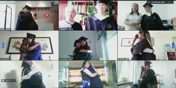 线上参会的家长为身披学位服毕业的孩子拨穗后,深情拥抱,场面十分感人。