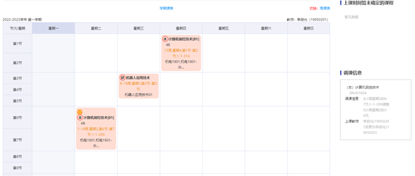 教师可以从本科教务管理系统登录查看课表,课表中包含自己承担的本科生和研究生课程。在本硕博一体化课表中,本硕博课程分别在课程标签的左上角进行了标注。课程标签左上角其他类型的标注会在课表的右侧集中说明。