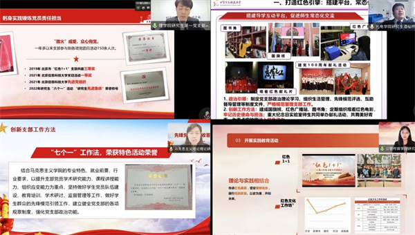 经过前期培育建设、学院推荐、学校初审,共有11个党支部和8名党员参加研究生党建双创汇报验收,11个党支部从深入开展思想政治理论学习、高度重视学风建设、大力加强党支部队伍建设、精心创建支部文化、积极参与志愿服务等方面,介绍了主要做法和取得的成果;8名党员分别从思想品德、学习科研、组织工作以及社会实践等方面进行汇报,分享了在工作和学习生活中如何发挥先锋模范作用,展现信息科大研究生的风采。