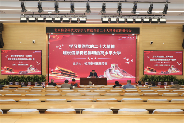 11月22日,校党委书记王传亮以“学习贯彻党的二十大精神,建设信息特色鲜明的高水平大学”为主题,向全校师生宣讲党的二十大精神。宣讲会以线上线下相结合的方式进行,主会场设在新校区文理楼307报告厅。