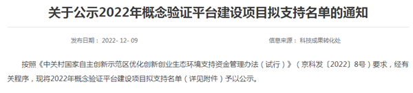 概念验证平台建设项目是北京市为进一步将成果转化支持环节前移,聚焦科技成果转化更初期的概念验证阶段,布局支持科技成果转化“最初一公里”的重要举措,2022年共批准设立首批概念验证平台12个,其中市属高校2个,立项后每个平台将获得市科委、中关村管委会连续3年,每年不高于500万元的成果转化资金支持。