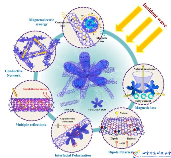 此外,该团队在二维吸波材料领域也取得了创新性的科研成果。采用了基于柯肯德尔扩散效应的原位各向异性取向生长策略,制备出具有多级结构的碳基磁性复合材料γ-Fe2O3@N-rGO@MWCNTs。该多级结构具体为核-壳结构的松果状纳米花结构。上述结构可提供丰富的吸波效应,包括传导损耗,界面极化,偶极极化,涡流损耗和自然共振,特别是松果状核-壳结构纳米花的电磁协同效应,表现出优异的电磁波吸收性能。相关成果于2022年11月发表在Journal of Alloys and Compounds期刊上(影响因子6.371,TOP期刊),廖擎玮副研究员、秦雷研究员为共同通讯作者。