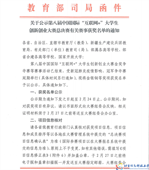 近年来,学校紧扣高水平应用型大学的办学定位和学校创新实践的特色优势,将创新创业教育融入人才培养全过程,与专业教育相结合,信息特色引领全面推进课程思政建设和新工科、新文科建设。构建了基础实践训练、交叉创新研究、创新创业教育分层递进的创新创业教育大平台,通过动手实践、交叉创新、以创促学,促进学生创新创业能力提升和个性化发展,形成实践认证、持续改进、成果导向螺旋式递进的良性循环。2022年,我校在“互联网+”大赛北京赛区比赛中再创佳绩,获得市级一等奖2项,二等奖3项,三等奖33项。自参赛以来,共获得市级以上奖励150项,其中国家级铜奖5项。(供稿/图片:教务处 陈佳男 郑小博 编辑:田驰正 审核:杨静)