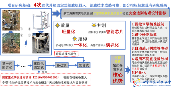 团队基于对固定式和移动式割胶机器人长达5年研究、4代固定式割胶机器人技术迭代,颠覆性地研发一种复合式多功能割胶机器人,首创性地集固定式和移动式机器人优点为一体,一机多树、精度高、成本低,可以快速推向市场形成生产力,为割胶企业大量节约成本,增强橡胶行业竞争力,为胶农创造更多收益,对乡村振兴及巩固脱贫成果具有关键性作用。