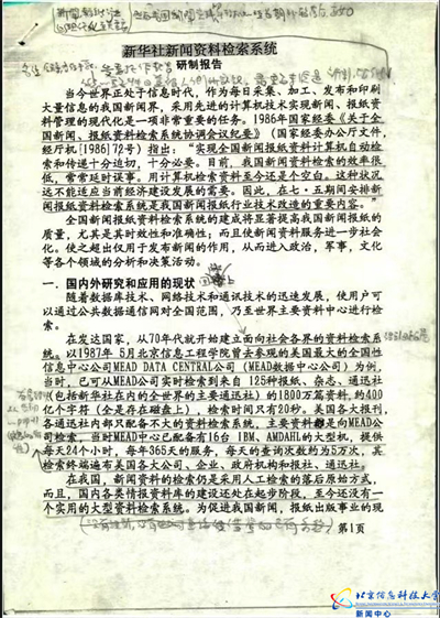 本次捐赠的珍贵历史资料是形成于1988年的《新华社新闻资料检索系统研制报告》,报告的研制单位为北京信息工程学院和新华社技术局。新华社新闻资料检索系统是“七五”国家重点科技攻关项目,此项目当时在新闻资料检索和计算机应用领域处于全国领先水平。本份历史资料是在电子工业部举办的项目鉴定会上,该项目顺利通过专家鉴定的报告资料,材料上面的笔迹是苏东庄教授的详细批注。苏东庄教授是国内中文全文检索技术研究的开创者,曾经担任北京信息工程学院副院长,他参加研制了我国第一台计算机(104机),一直致力于中国计算机事业的发展,并取得了巨大的科研成果,1997年获得“国家科技进步二等奖”。