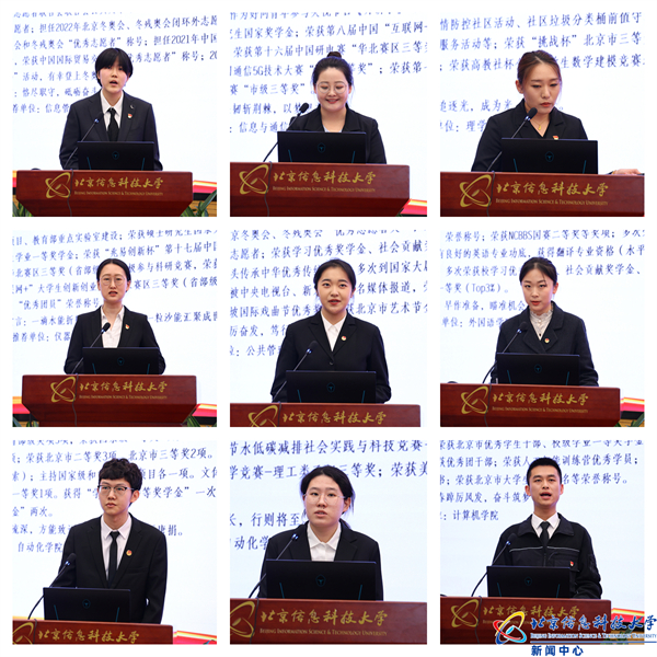 来自教学、科研、学工等领域的11个集体候选代表和20名学生候选人逐一进行展示,讲述了自己在服务国家战略、首都发展、学校建设中创先争优、勇当先锋、勤于学习、善于创造、甘于奉献的先进事迹,充分展示了信息科大青年师生虚怀若谷、奋发向上的青春风貌。候选代表们的精彩展示,赢得了在场师生的阵阵掌声。
