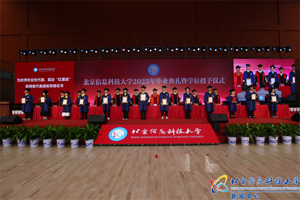 全体校领导为优秀毕业生代表、毕业生“红星奖”获得者代表颁发荣誉证书。