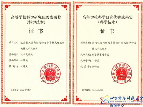 近日,教育部颁发了高等学校科学研究优秀成果奖(科学技术)获奖证书。我校祝连庆教授主持完成的《航空航天器高温高动态多参数光纤监测关键技术及应用》项目荣获技术发明一等奖,为我校首次荣获高等学校科学研究优秀成果奖(科学技术)一等奖,我校张仰森教授主持完成的《面向社交网络的多情景内容挖掘分析关键技术及应用》项目荣获科学技术进步二等奖。
