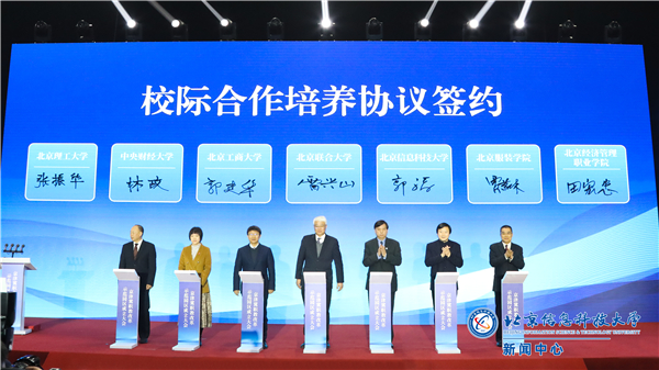 郭福与北京理工大学、中央财经大学、北京工商大学、北京联合大学、北京服装学院、北京经济管理职业学院领导共同签署校际合作培养协议。根据校际合作培养协议,我校经济管理学院的财务管理(数字财务)、会计学(大数据会计)、公共管理与传媒学院的网络与新媒体(数字媒体运营)等三个专业作为主办专业列入校际合作联合培养方案。