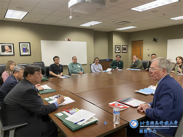 在密歇根州立大学,密歇根州立大学教务长兼学术事务执行副校长托马斯·D·耶施科(Thomas D. Jeitschko)对我校代表团的来访表示热烈欢迎,并介绍了密歇根州立大学近些年发展的成绩和主要变化。他强调,密歇根州立大学高度重视跨文化交流与国际化人才培养,期待两校在工程、信息技术等优势领域内开展学术交流及学生联合培养等项目共建。郭福介绍了我校的办学理念、发展特色、优势专业学科以及近年来学校立足时代发展、科技变革,在具有全球视野的创新型人才培养和教育国际化方面的深入思考与不懈努力。郭福表示,密歇根州立大学是全美著名的科研引擎之一,在自然科学、工程技术、教育、能源与环境等领域实力雄厚、成果斐然。北京信息科技大学以信息技术为特色,锚定新一代信息技术领域,坚持开放视野和前瞻布局,围绕信息技术、智能制造和大数据等战略性新兴产业发展需要构建以信息特色学科为主干的学科专业体系,期待双方在先前友好往来的基础上深化合作,形成更为浓厚的学术氛围,构建更为开放的合作机制,携手巩固两校在工程技术领域的优势地位,共育创新型人才,推动前沿科技创新取得新突破。