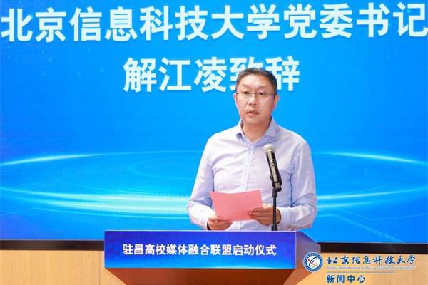 解江凌对驻昌高校媒体融合联盟的成立表示热烈的祝贺,对于莅临现场的领导嘉宾致以诚挚的欢迎!他表示,作为市属驻昌高校,能够参与承办此次成立大会,并且能够成为联盟成员单位,和各兄弟高校共同助力昌平区宣传思想文化工作,我们责无旁贷也深感荣幸。他介绍了学校的办学历史、办学特色和近些年学校立足学科优势,聚焦学科交叉融合,在推动媒体融合发展方面所做的工作和取得的创新成果。他表示,学校正处于事业发展的最好时期。学校将乘势而上,以“驻昌高校媒体融合联盟”成立为契机,发挥信息特色优势,顺应数智时代发展潮流,将新一代信息技术贯穿宣传工作全过程,在昌平区委宣传部的指导下,与区融媒体中心及各驻昌高校一同,凝聚校城融合共识,深化战略合作、携手英才共育,为助力构建起区域协同、优势互补、资源共享的区域媒体发展新格局,为服务昌平区各项事业高质量发展贡献融媒传播力量。