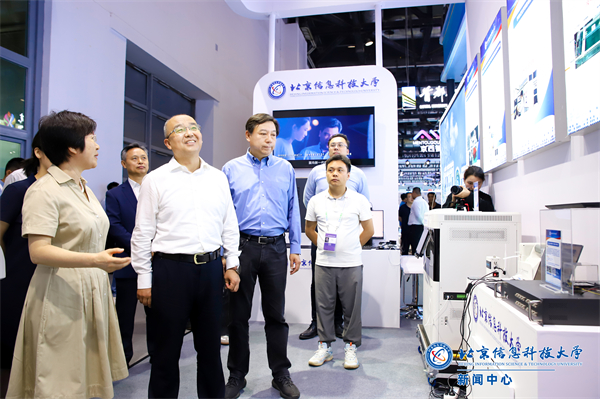 第26届中国北京国际科技产业博览会于日前隆重开幕。7月14日,北京市委常委、教育工委书记于英杰率队参观博览会,并驻足我校展位察看指导学校电子信息、人工智能领域科技创新成果。市贸促会党组书记、主任郭怀刚、市委教育工委办公室主任刘忠心陪同参观。校党委副书记、校长郭福热情接待于英杰一行并介绍参展成果和展位整体情况。