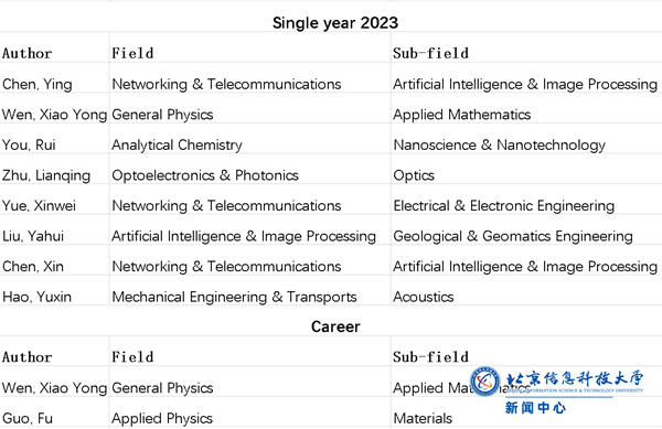 此次更新的榜单中,我校在Networking & Telecommunications网络与电信、General Physics普通物理学、Analytical Chemistry分析化学、Optoelectronics & Photonics光电子学与光子学、Artificial Intelligence & Image Processing人工智能与图像处理、Mechanical Engineering & Transports机械工程与运输、Applied Physics应用物理学7个学科领域共有9位学者入选,其中陈昕、祝连庆、陈莹、闻小永、尤睿、岳新伟、刘亚辉、郝育新8位学者入选 “年度科学影响力榜单”,闻小永教授 、郭福教授入选 “终身科学影响力榜单”。