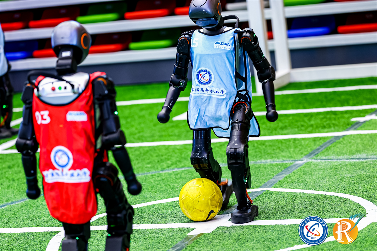 田径赛道上,仿人机器人以稳健步伐跨越障碍;点球大战中,守门机器人通过视觉系统精准预判射门角度,完成一次精彩的侧扑救球;类人足球2V2赛场更是高潮迭起,机器人带球连续过人后突入禁区,完美展现其运动控制与团队配合能力。