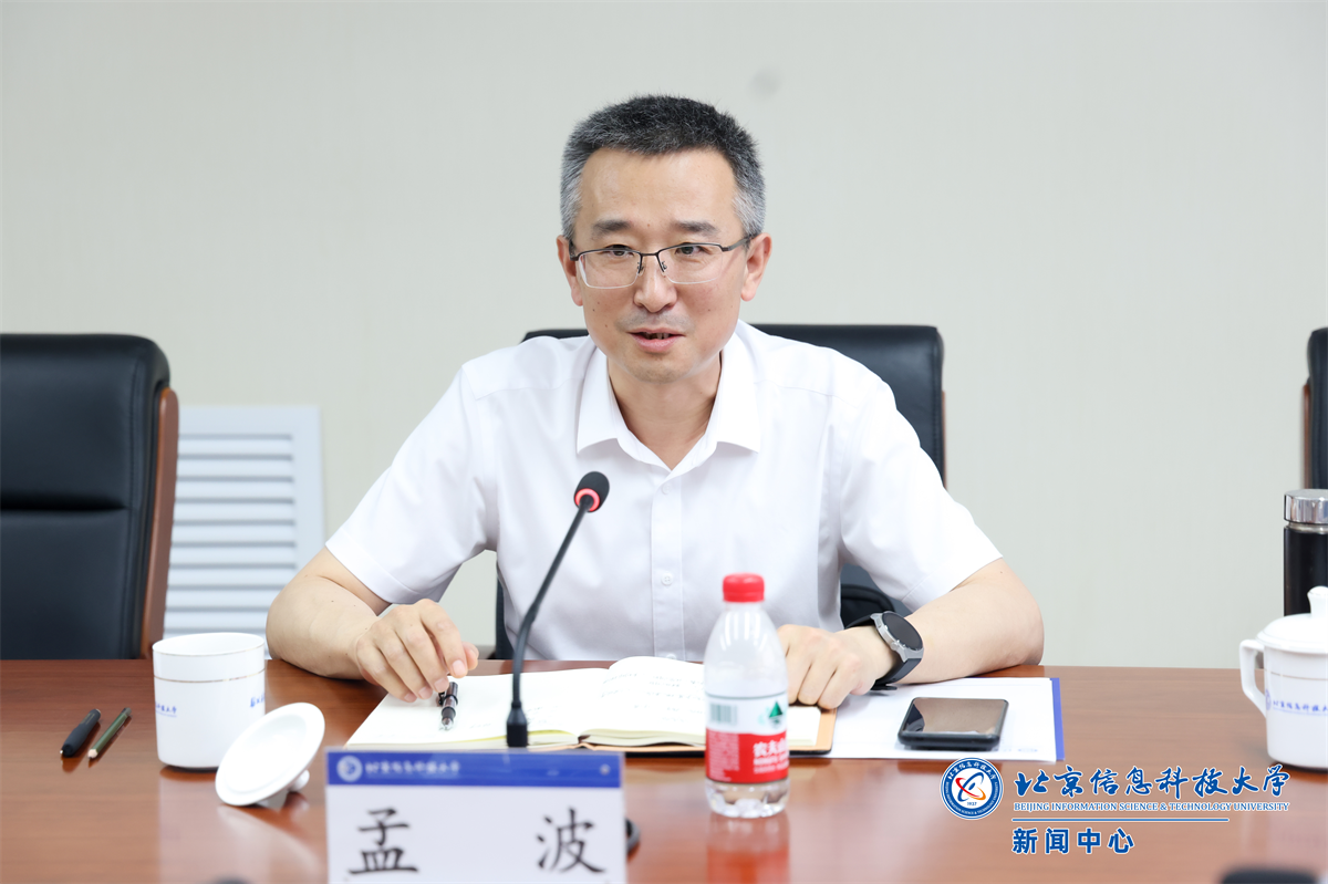 解江凌代表学校对孟波一行到访交流表示热烈欢迎,并由衷感谢北京市知识产权局长期以来对学校建设发展给予的大力支持。他在介绍中简要阐述了学校的办学特色、学科布局、科研优势以及在知识产权工作方面的整体规划等情况,着重介绍了学校在新一代信息技术、人工智能等前沿领域的深厚科研积累与取得的显著成果。解江凌表示,此次调研交流为双方深化合作、共谋发展提供了重要契机,他希望双方能够以此为契机,携手并进,充分发挥各自优势,共同为推动北京市知识产权事业迈向更高水平贡献力量。