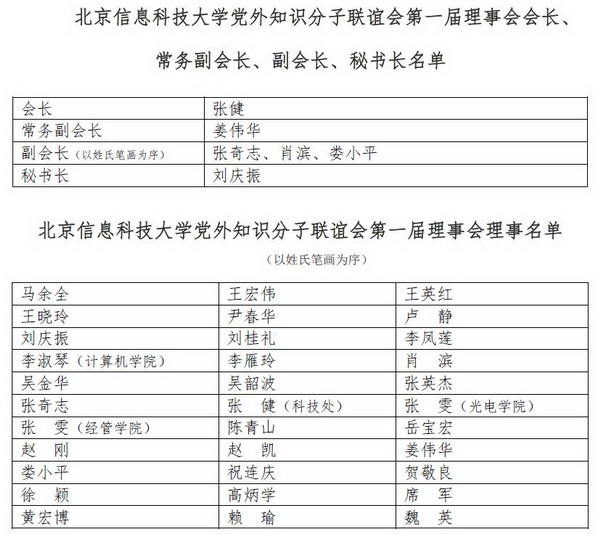 知联会理事审议通过了《北京信息科技大学党外知识分子联谊会章程(试行)》(草案)、《北京信息科技大学党外知识分子联谊会第一届理事会会长、常务副会长、副会长、秘书长选举办法》(草案)、选举产生了知联会第一届理事会会长、常务副会长、副会长、秘书长。许宝杰宣读了选举结果。