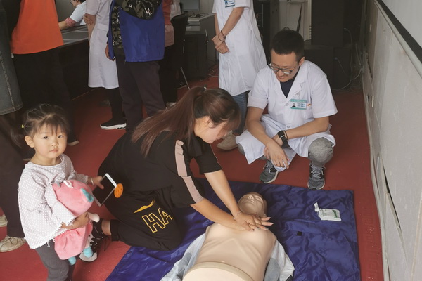 李莉医生从高血压的症状、如何预防、怎样治疗三个方面为村民们进行了深入浅出的阐述。张丽和李超两位医生相互配合,为村民们认真讲解、演示急救知识和心肺复苏的操作过程,并手把手指导村民实操练习。答疑互动环节,医生们依据所长,认真为村民们测血压、普及医学常识和健康知识、诊疗常见疾病、解答各种问题。整个活动过程,村民们听得认真、学得仔细。一位老大娘握着才秀芬的手说:“感谢医生到家里来帮我们看病,讲得还明白,真贴心啊!”
