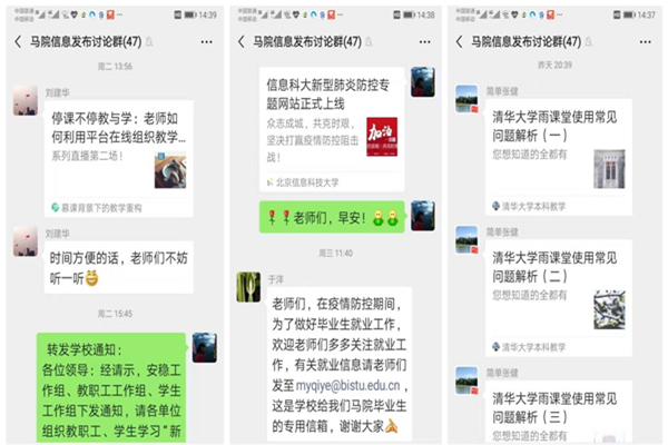 在北京市委和学校下达各项部署之后,党总支对抗疫工作进行了全面安排部署,制定了《马克思主义学院防控新型冠状病毒感染的肺炎疫情工作实施方案》。成立了以学院领导为主要成员的防控疫情工作小组,建立了党总支书记排查教师、副书记排查学生、党支部书记联系每一位师生、组织员整合统计数据、党总支书记审核把关上报数据的闭环防控管理体系。