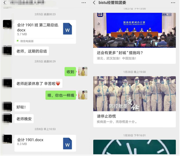 学生们也感受到了来自学校大家庭的关系和温暖。学校建立了专门的信息宣传机制、心理健康防护机制、应急工作机制等,充分依托网络平台,坚守互联网阵地,推出系列防疫战“疫”文章,做好防疫知识普及、防疫心理疏导等工作,同时拓宽网络育人空间,号召所有师生及时学习“新型冠状病毒肺炎防疫安全公益网络课程”以及《老师请回答—疫情防控特别节目》,并整合线上育人资源,鼓励学生及时正确了解疫情相关,并把握假期时间、努力提升自我。