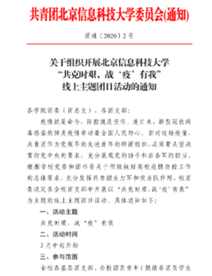 目前,新冠肺炎疫情阻击战进入攻坚阶段,疫情就是命令,防控就是责任。校团委全体同志第一时间关注疫情进展,通过线上工作会议,层层落实工作要求,带领信息科大广大青年团员,全力做好战“疫”云动员,向大学生青年发出防控疫情的倡议,号召大家做好居家防疫卫生,做好寒假自学自修功课,开展线上共青团理论学习。