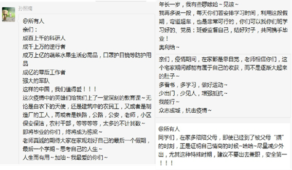 面对突如其来的疫情,自动化辅导员积极响应学校号召,放弃寒假休息,从1月23日起,迅速进入战斗状态,第一时间把有关政策、各项信息和学校的关心传递到每一位学生。统计信息,他们经常伏案到深夜;一日一报,他们每每逐一叮嘱;年级群里,一直传递着温暖与正能量。
